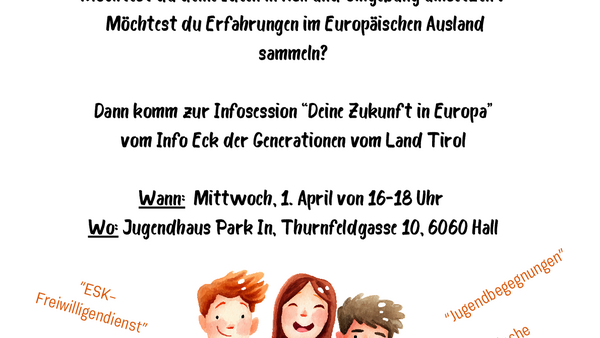 In der Infoveranstaltung mit dem InfoEck der Generationen des Landes Tirol am Mittwoch, dem 1.4.2026 von 16-18 Uhr im Jugendhaus Park In erfährst du von deinen Möglichkeiten und den Teilnahmevoraussetzungen. Wir zeigen dir, wie du dich engagieren und deine Ideen umsetzen kannst. Weitere Informationen zu den EU-Jugendprogrammen gibt es hier.